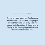 -10% of the proceeds provides clean water, hygiene and sanitation education to those in need, all over the world. See Your Impact for more information.