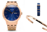 The Beck Series is bold, durable, robust and eye-catching. With a blue sunburst dial, day date display and sub-second dial, its the perfect combination of form and function. Its stainless steel case is guaranteed waterproof to a depth of 100 meters (330 feet) and flows, uninterrupted, into an integrated stainless steel bracelet. The characteristically shaped domed glass is crafted from ultra scratch resistant sapphire crystal and the movement that powers this watch is the NEW Miyota Cal.0T50.  Special Pack Includes: Beck, Morgan + Blue Tactical Strap + Rose Gold Water Cuff Bracelet. Order your pack and save 17%!